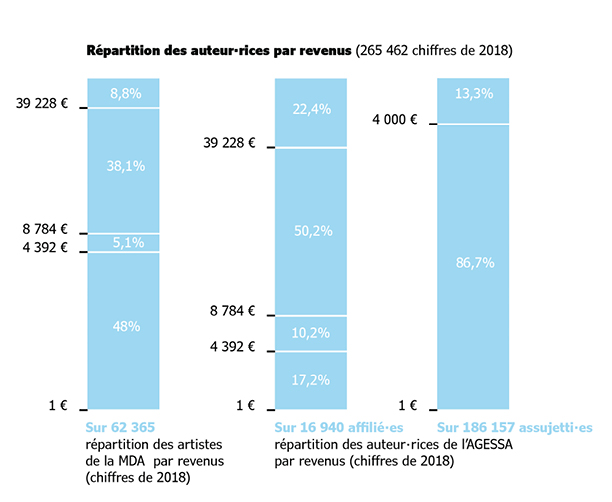 Since the end of the 1970s, artists-authors have had a social security system linked to the general system, which means that they have employee rights. Yet, their income comes from intellectual property (copyright) and freelance work (fees). To calculate their benefits, social security converts their income into a volume of hours based on minimum wage. This is called financial equivalence.