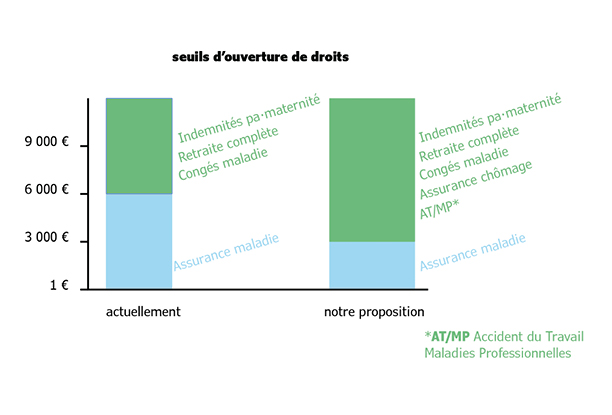 Dans notre proposition, les droits seront plus accessibles et les diffuseurs seront mis à contribution. Les artistes-auteur·ices cotiseront 17 % de leur bénéfice et les diffuseurs verseront une contribution égale à 5,15 % de la rémunération brute6. Pour 100 euros de revenus, une écrivaine versera 17 euros de cotisations auxquelles son diffuseur ajoutera 5,15 euros7. Grâce à ces contributions, elle aura accès à une assurance maladie dès le premier euro perçu, ainsi qu’à la totalité des autres droits à partir de 3000 euros de revenus annuels (chiffres d'affaires) : assurance chômage, accidents du travail et maladies professionnelles, retraite complète, congés maladie et pa·maternité.