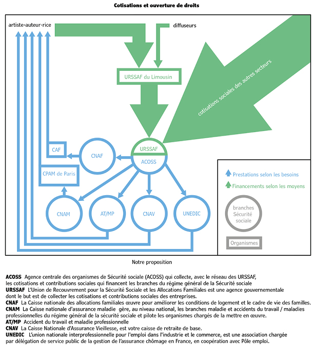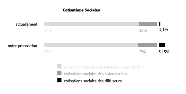 Ainsi, notre tribune proposait un ensemble de mesures concrètes pour ouvrir de nouveaux droits comme une assurance chômage aux travailleur·euses de l'art non salarié·es. Le statut que nous avons envisagé correspond à un régime de la continuation des revenus et des droits entre les engagements professionnels ; nous avons imaginé son financement, entre autres, par l'augmentation de la contribution dérisoire que paient actuellement les diffuseurs lorsqu’ils ont recours au travail d’artistes-auteur·ices en France (1,1 % de la rémunération brute, contre 46 % de cotisations patronales dans le secteur du spectacle).