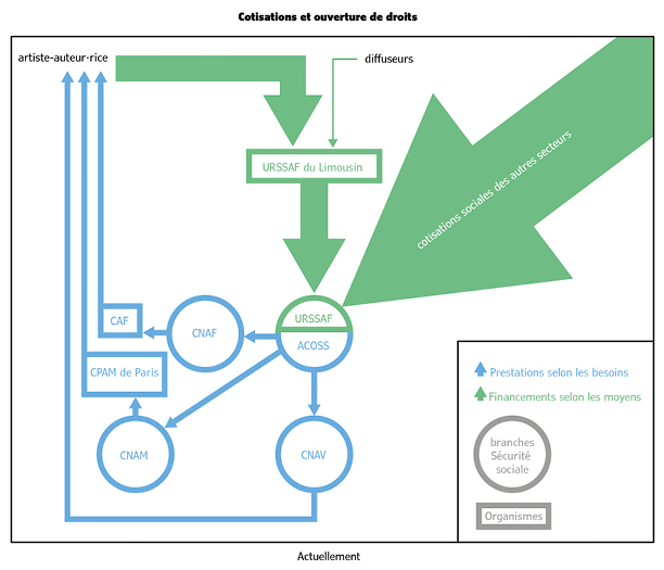 Actuellement, les artistes-auteur·ices cotisent à hauteur de 16 % de leur bénéfice5. Les diffuseurs versent une contribution supplémentaire d’un montant équivalent à 1,1 % de la rémunération brute. Ces cotisations donnent droit à une assurance maladie dès le premier euro perçu, ainsi qu’à la validation de 4 trimestres de retraite et à des congés maladie et pa·maternité dès 6000 euros de revenus annuels. En revanche, quel que soit son bénéfice, un·e artiste-auteur·ice n’a ni indemnités en cas d’accident du travail ou de maladie professionnelle, ni assurance chômage. Avec des seuils d’accès aussi élevés et des prestations aussi faibles, la couverture sociale des artistes-auteur·ices est médiocre et la cotisation impopulaire.